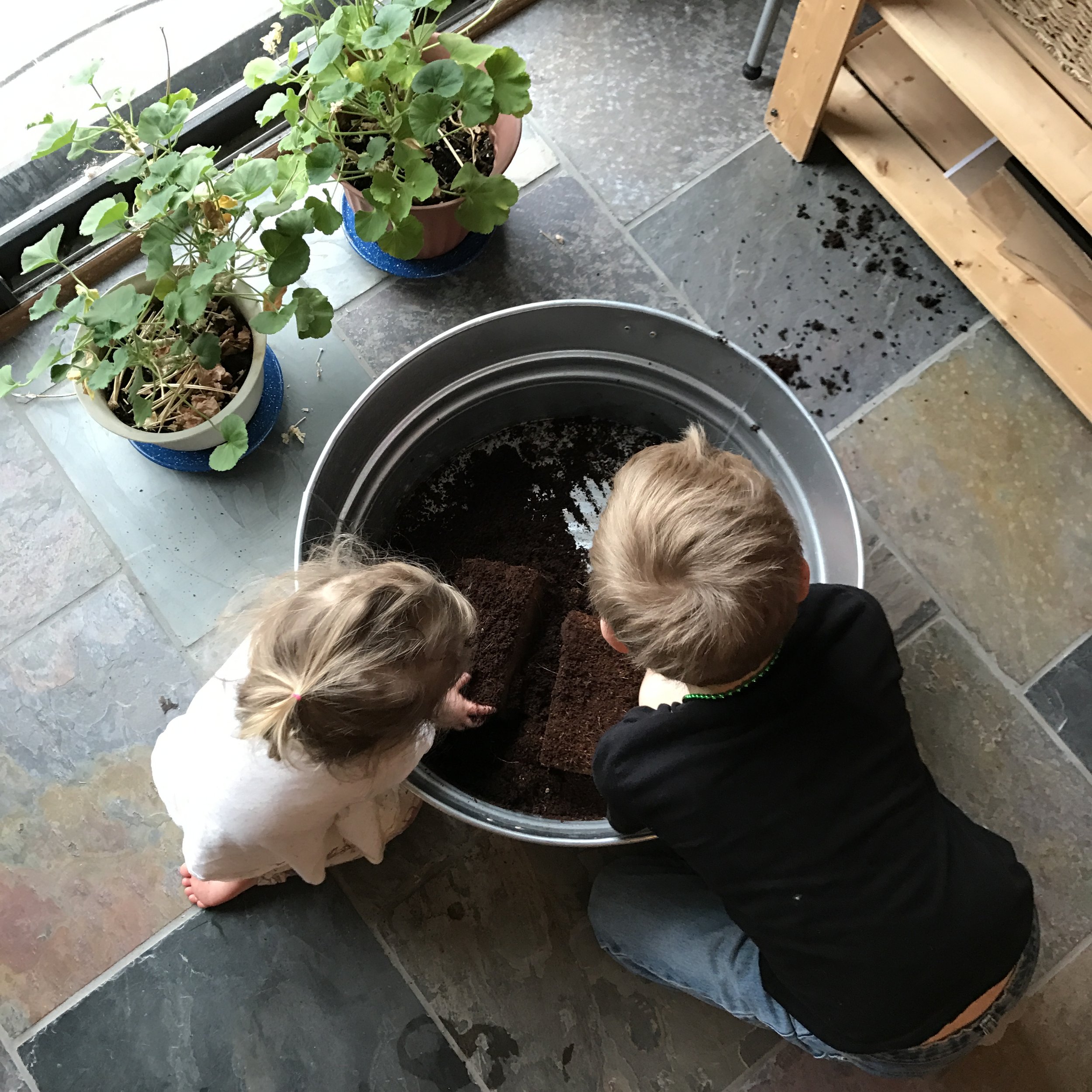 The best thing about an indoor growing space, is that it brings spring sensory indoors just a few months early - perhaps when it’s need most. Here we are playing in the soil, watering coconut coir for indoor seedlings.
