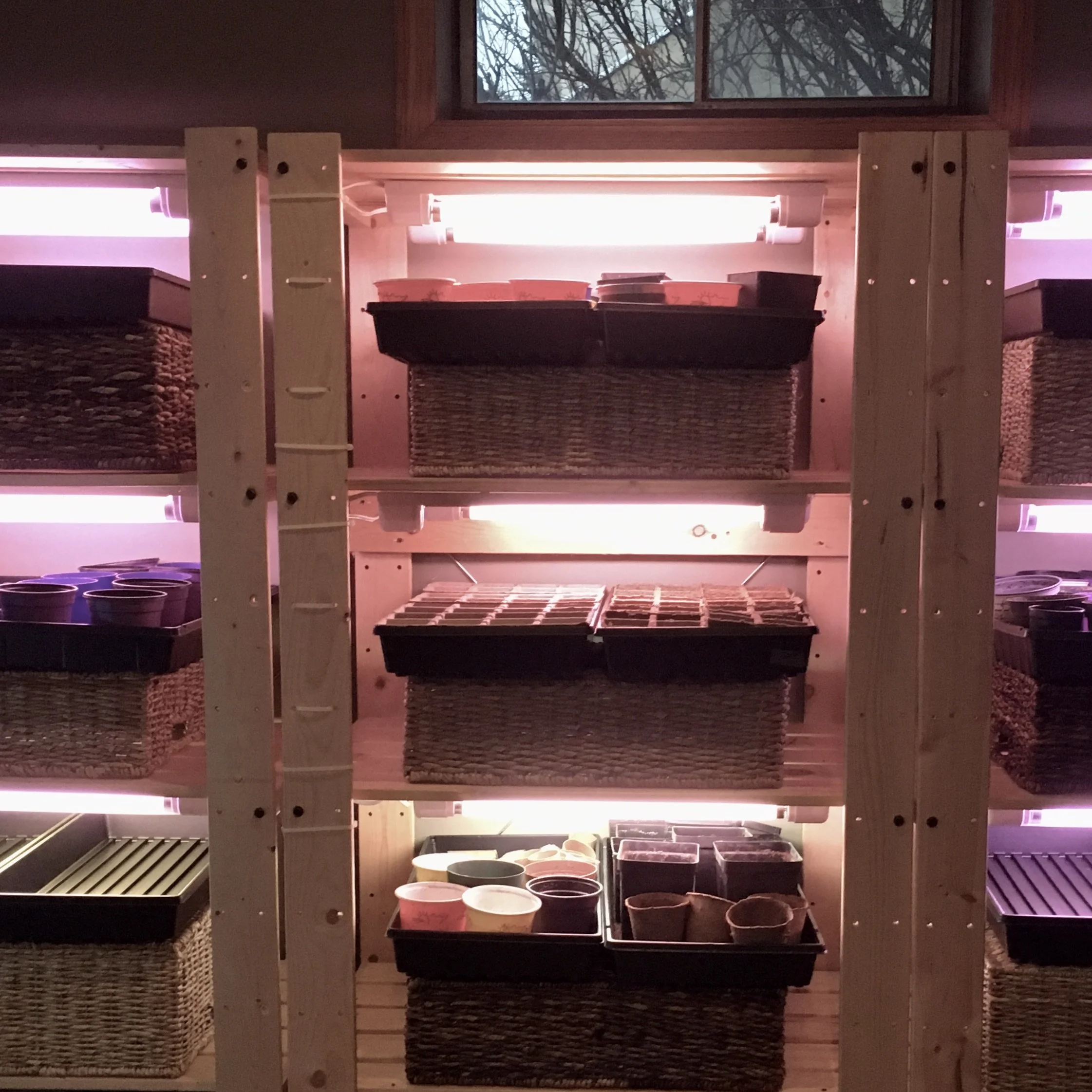 Our indoor space is next to eastern sun, with a hard stone floor surface that is helpful for any small spills of soil or water. It is also close to an indoor sink / water source. We have floor and table work space, as well as shelves and grow lights to hold the trays.